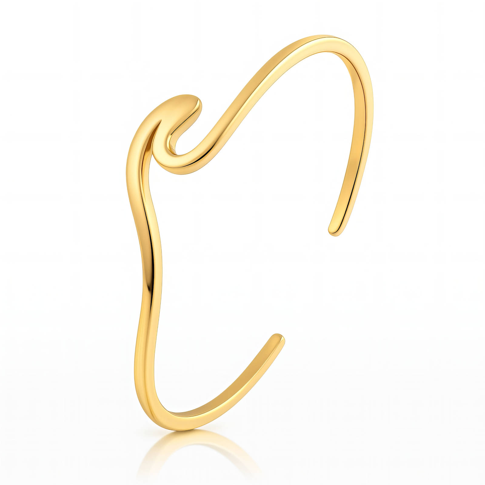 Schmücken Sie sich mit der Zartheit des Armreifs Xenia. Dieser stilvolle feste Armreif besticht durch seine einzigartige gewellte Form, die an fließendes Gold erinnert. Dank des offenen Designs (Cuff) passt er sich leicht der Größe Ihres Handgelenks an. Hergestellt aus hochwertigem Chirurgenstahl, ist er 100 % wasserdicht, hypoallergen und farbbeständig. Ein modernes Stück für Liebhaberinnen des Minimalismus.